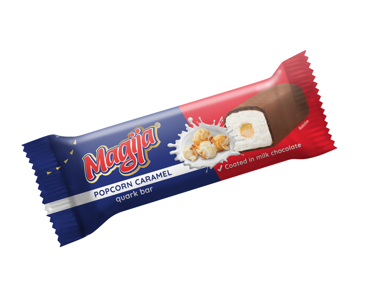Magija curd snack with popcorn flavor and salted caramel filling coated in milk chocolate 40g