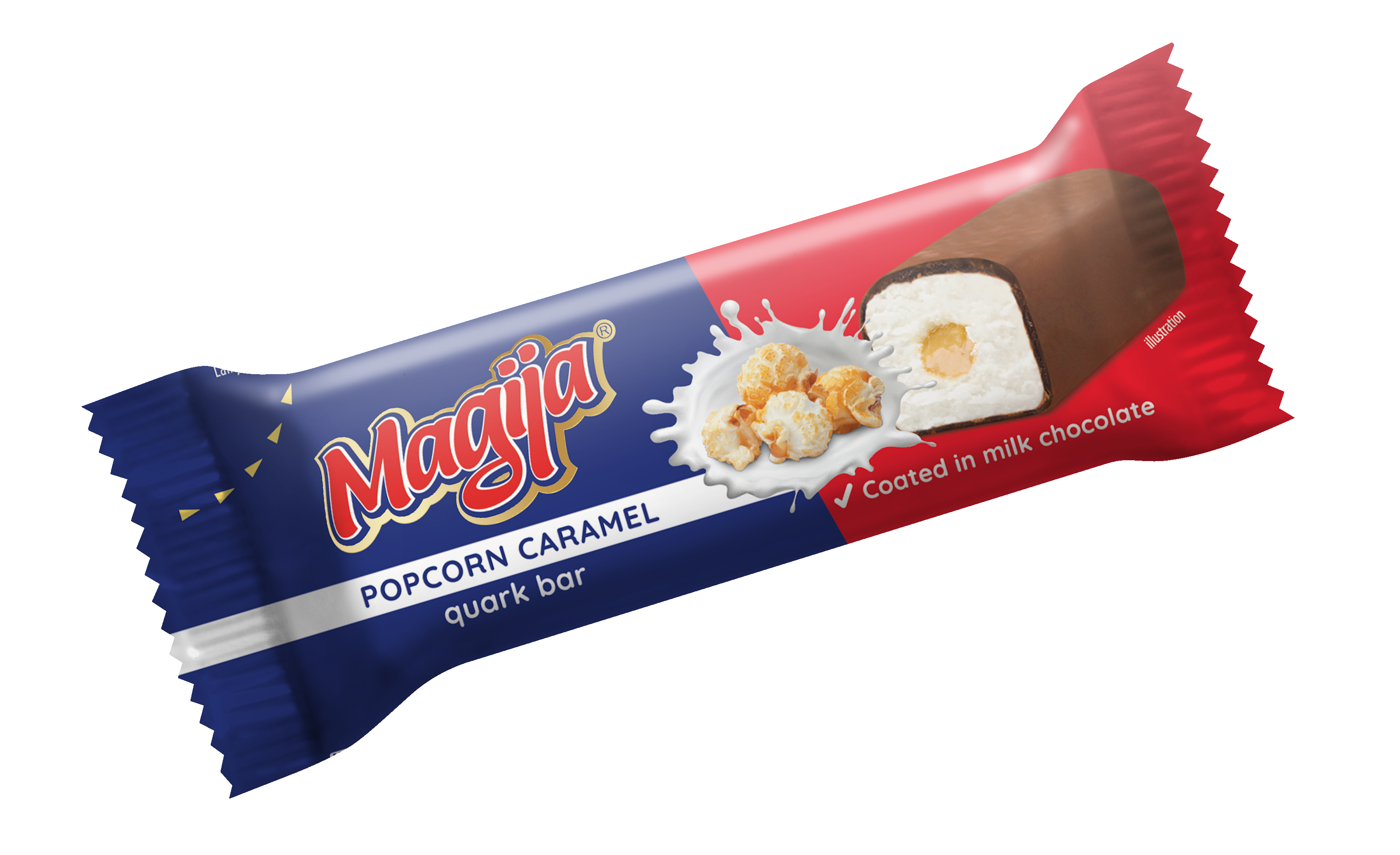 Curd snack with popcorn flavor and salted caramel filling – an exceptional blend of sweetness and saltiness that instantly evokes the pleasures of the cinema.
